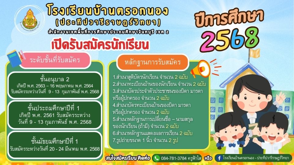 โรงเรียนบ้านตรอกนอง(ประทีปวารีราษฎร์วิทยา) เปิดรับสมัครนักเรียน ปีการศึกษา 2568 สนใจสมัครเรียน ติดต่อ 084-781-3784 ครูฟ้าใส หรือ ติดต่อผ่านเพจเฟชบุ๊ก : โรงเรียนบ้านตรอกนอง - ประทีปวารีราษฎร์วิทยา ยินดีต้อนรับสู่เว็บไซต์โรงเรียนบ้านตรอกนอง(ประทีปวารีราษฎร์วิทยา) สามารถติดตามข่าวสาร สอบถามติดต่อเพิ่มเติมได้ที่ Facebook : โรงเรียนบ้านตรอกนอง-ประทีปวารีราษฎร์วิทยา หรือ โทร 039-386009