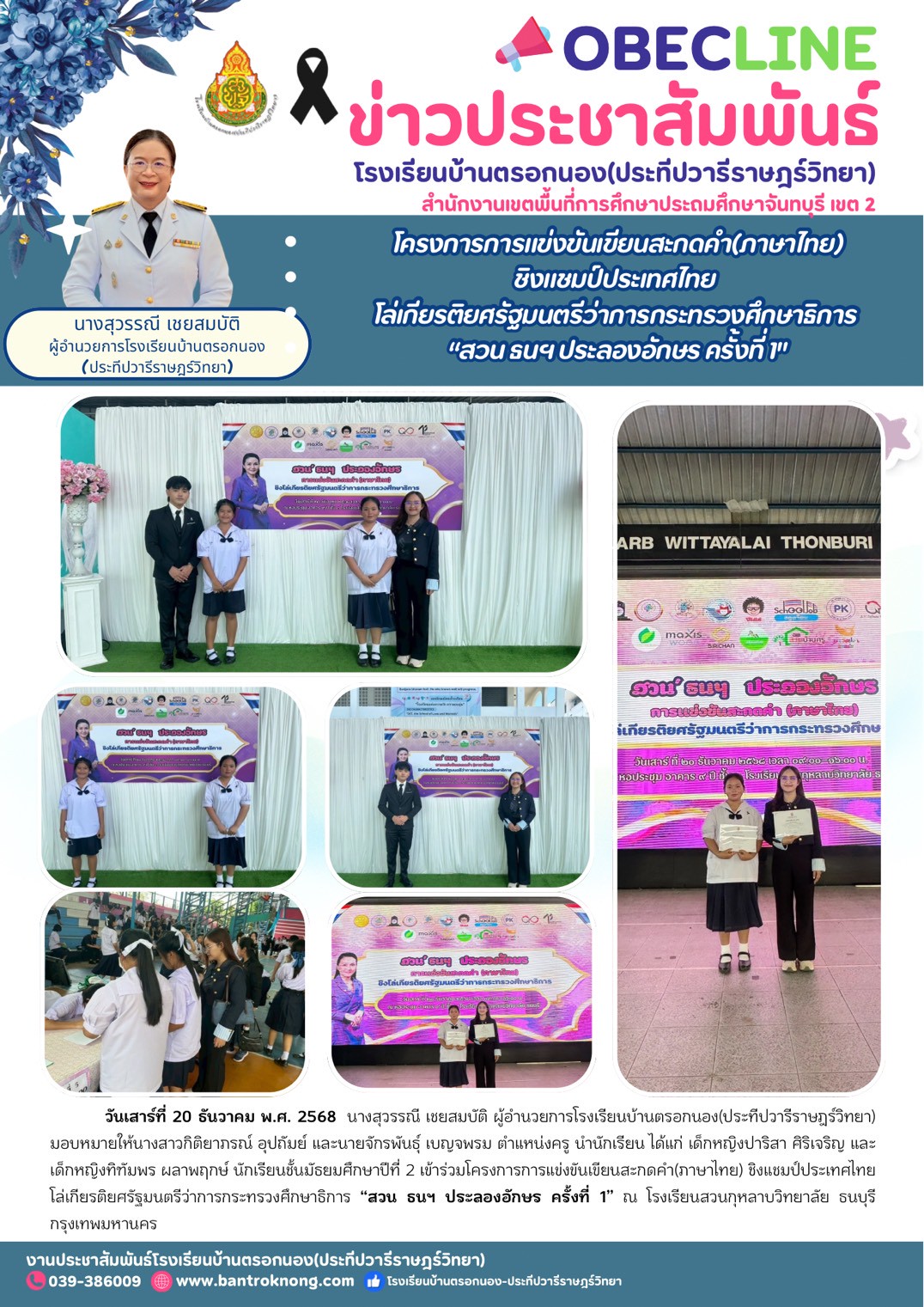 | ?️วันเสาร์ที่ 20 ธันวาคม พ.ศ. 2568 นางสุวรรณี เชยสมบัติ ผู้อำนวยการโรงเรียนบ้านตรอกนอง(ประทีปวารีราษฎร์วิทยา) มอบหมายให้นางสาวกิติยาภรณ์ อุปถัมย์ และนายจักรพันธุ์ เบญจพรม ตำแหน่งครู นำนักเรียน ได้แก่ เด็กหญิงปาริสา ศิริเจริญ และ เด็กหญิงทิฑัมพร ผลาพฤกษ์ นักเรียนชั้นมัธยมศึกษาปีที่ 2 ✅เข้าร่วมโครงการการแข่งขันเขียนสะกดคำ(ภาษาไทย) ชิงแชมป์ประเทศไทย โล่เกียรติยศรัฐมนตรีว่าการกระทรวงศึกษาธิการ “สวน ธนฯ ประลองอักษร ครั้งที่ 1” ?ณ โรงเรียนสวนกุหลาบวิทยาลัย ธนบุรี กรุงเทพมหานคร |