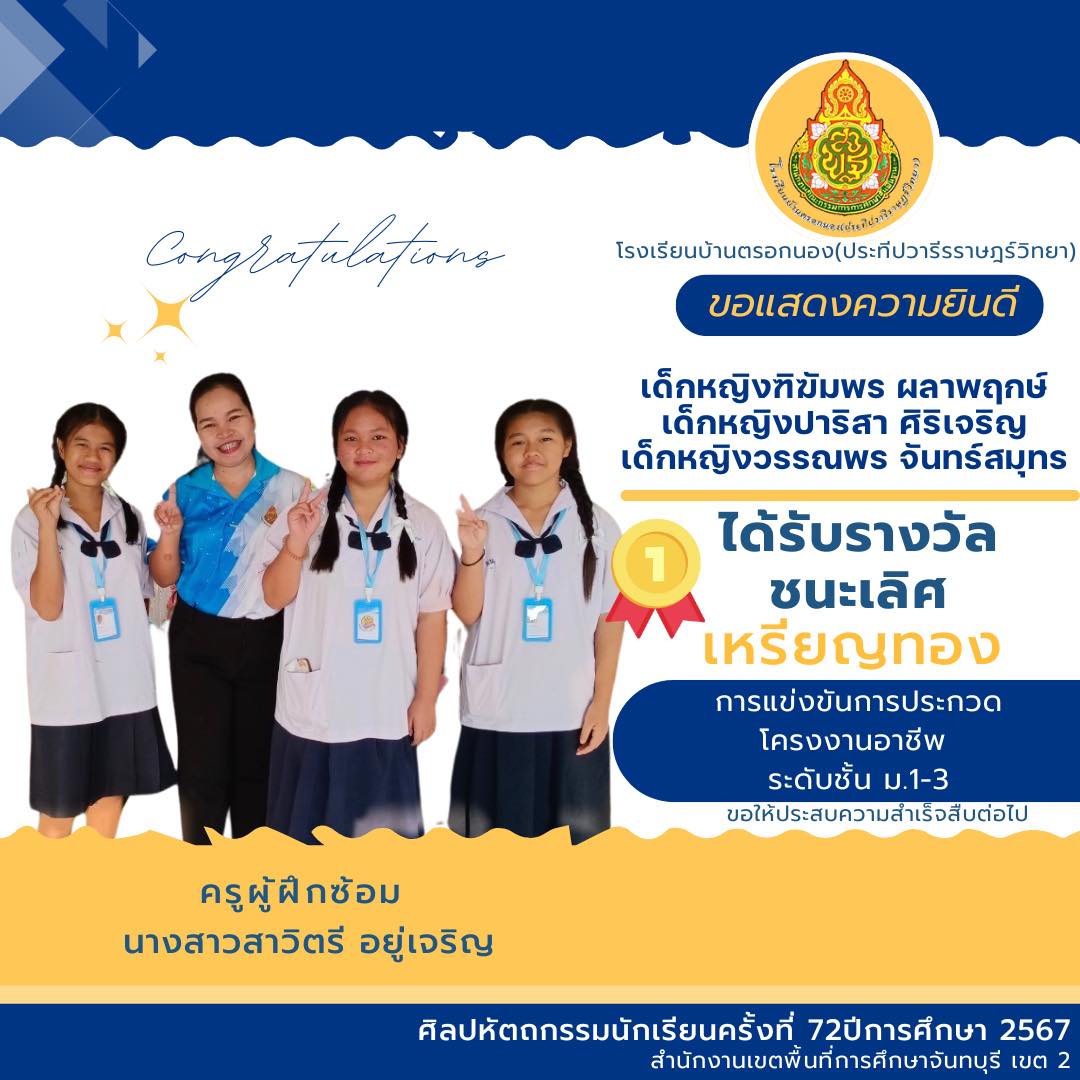 ชนะเลิศอันดับ 1 เหรียญทอง การแข่งขันการประกวดโครงงานอาชีพ ระดับชั้น ม.1-ม.3