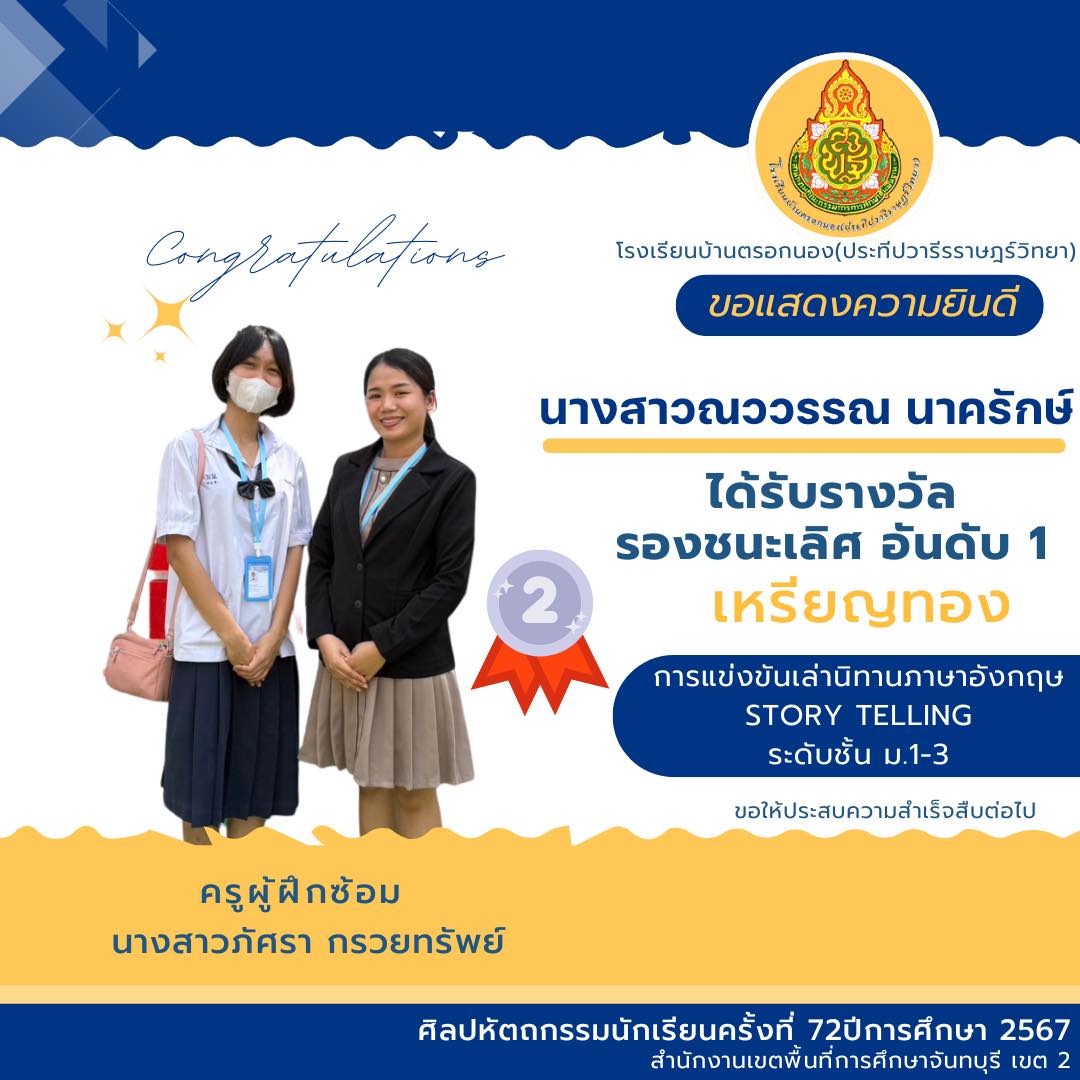 รองชนะเลิศอันดับ 1 เหรียญ การแข่งขันเล่านิทานภาษาอังกฤษ ม.1-ม.3