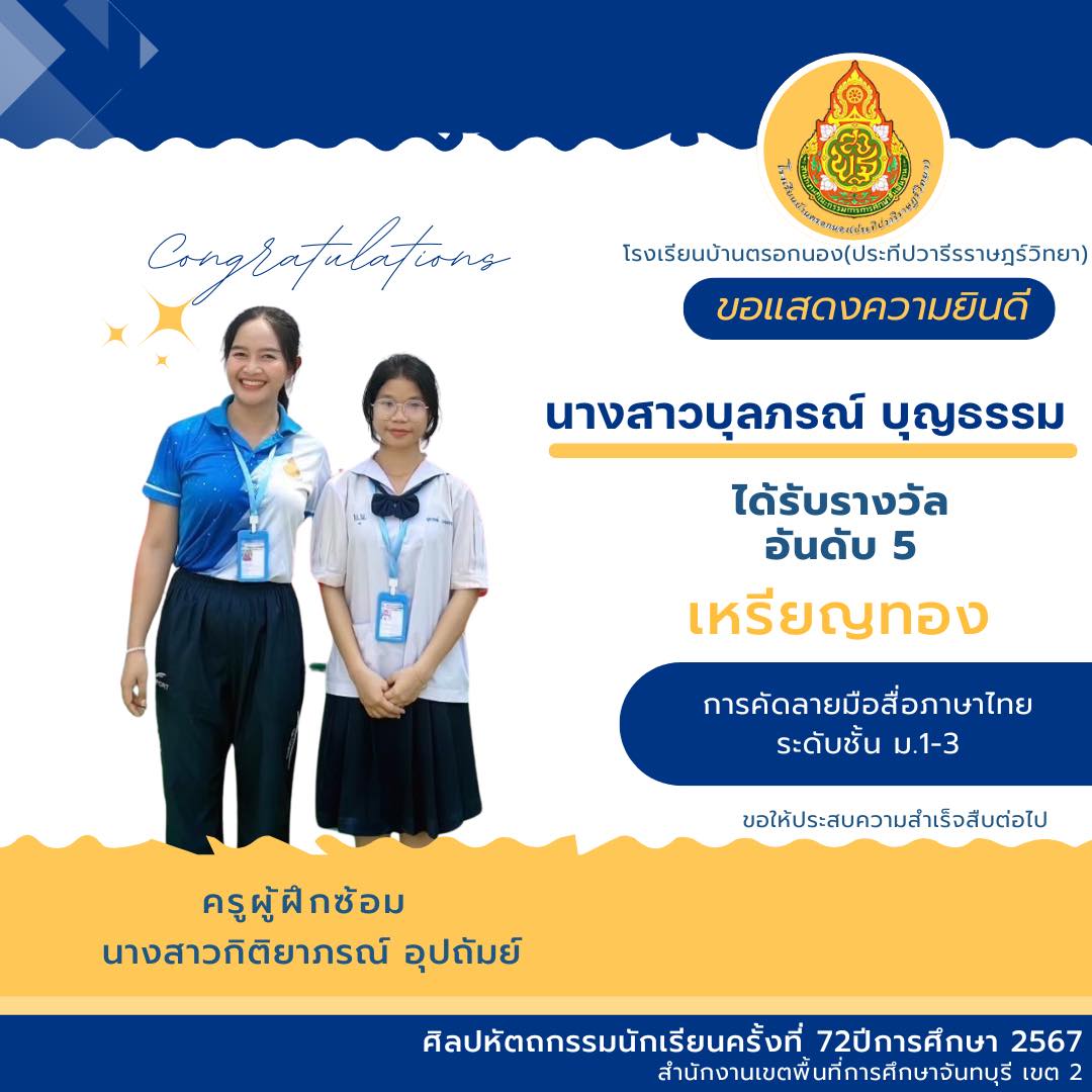 รางวัลเหรียญทอง อันดับ 5 แข่งขันการคัดลายมือสื่อภาษาไทย ม.1 - ม.3
