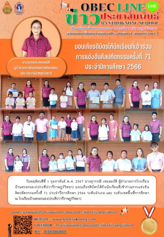 มอบเกียรติบัตรกับนักเรียนที่เข้าร่วมการแข่งขันศิลปหัตกรรม ครั้งที่ 71